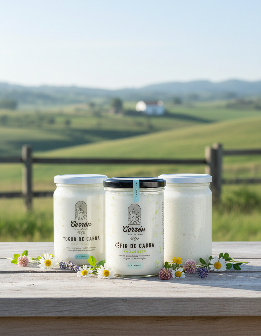 Yogur, requesón y kéfir de cabra elaborados con leche fresca y procesos artesanales.